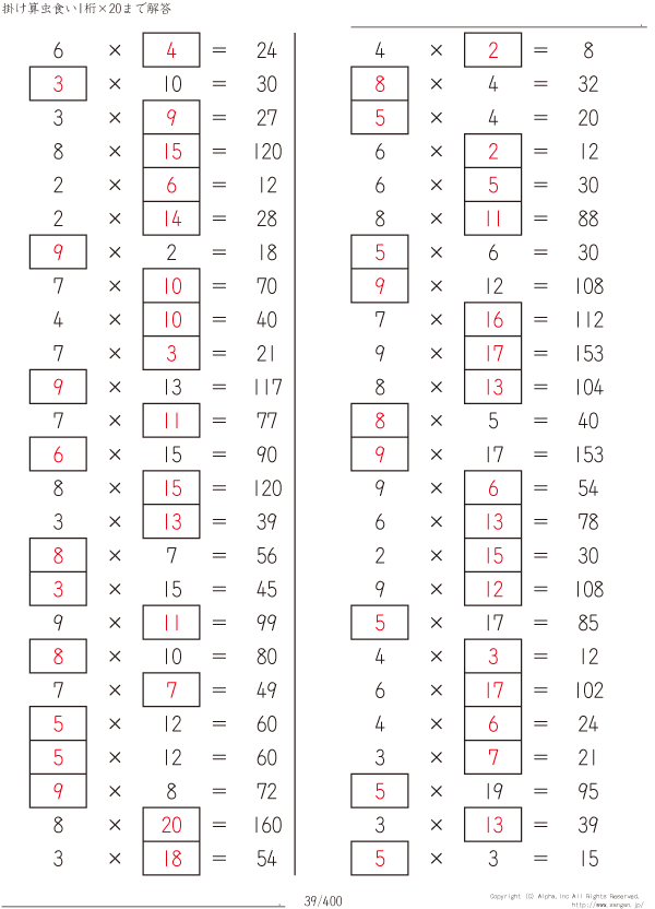 1桁かける20までの掛け算 [解答]039/400