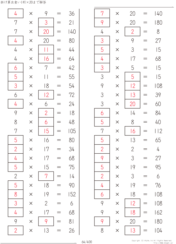 1桁かける20までの掛け算 [解答]064/400