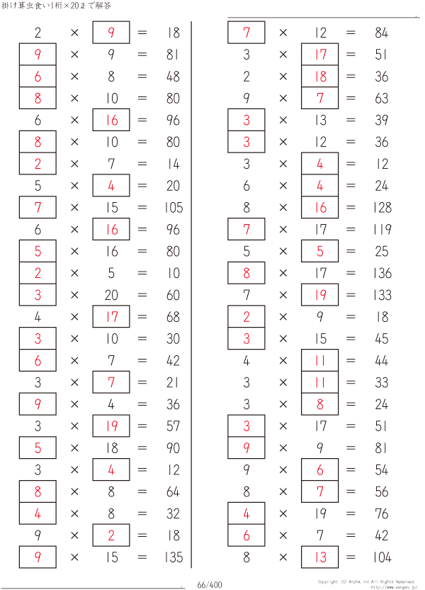 上記のボタンから「1桁かける20までの掛け算」の算数数学ドリル・計算ドリル(PDFプリント)がダウンロードできます。個人利用は無料です(家庭以外での配布は有料です)。