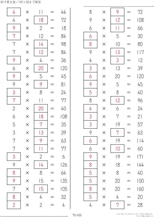 上記のボタンから「1桁かける20までの掛け算」の算数数学ドリル・計算ドリル(PDFプリント)がダウンロードできます。個人利用は無料です(家庭以外での配布は有料です)。