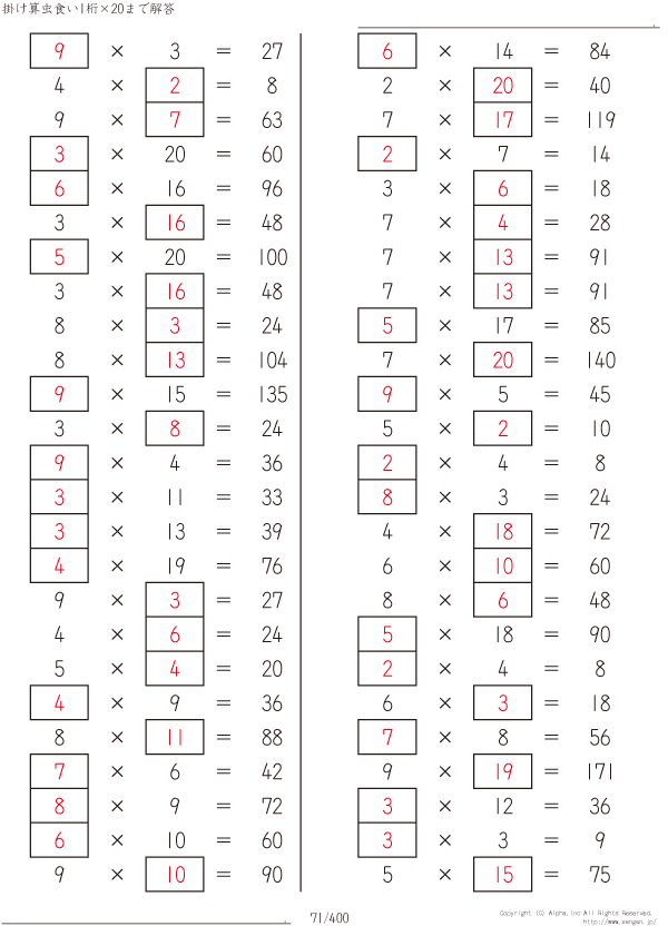 上記のボタンから「1桁かける20までの掛け算」の算数数学ドリル・計算ドリル(PDFプリント)がダウンロードできます。個人利用は無料です(家庭以外での配布は有料です)。