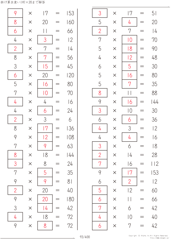 上記のボタンから「1桁かける20までの掛け算」の算数数学ドリル・計算ドリル(PDFプリント)がダウンロードできます。個人利用は無料です(家庭以外での配布は有料です)。