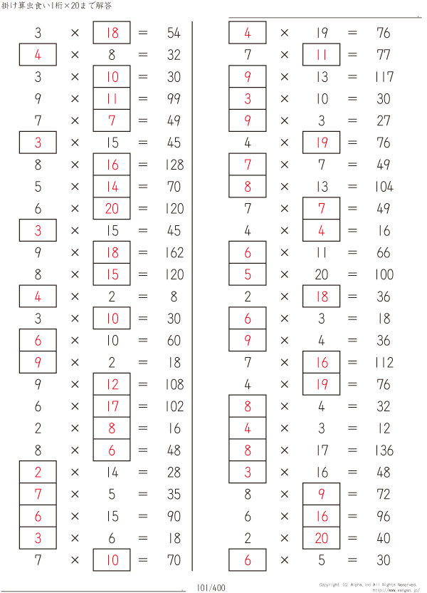 上記のボタンから「1桁かける20までの掛け算」の算数数学ドリル・計算ドリル(PDFプリント)がダウンロードできます。個人利用は無料です(家庭以外での配布は有料です)。