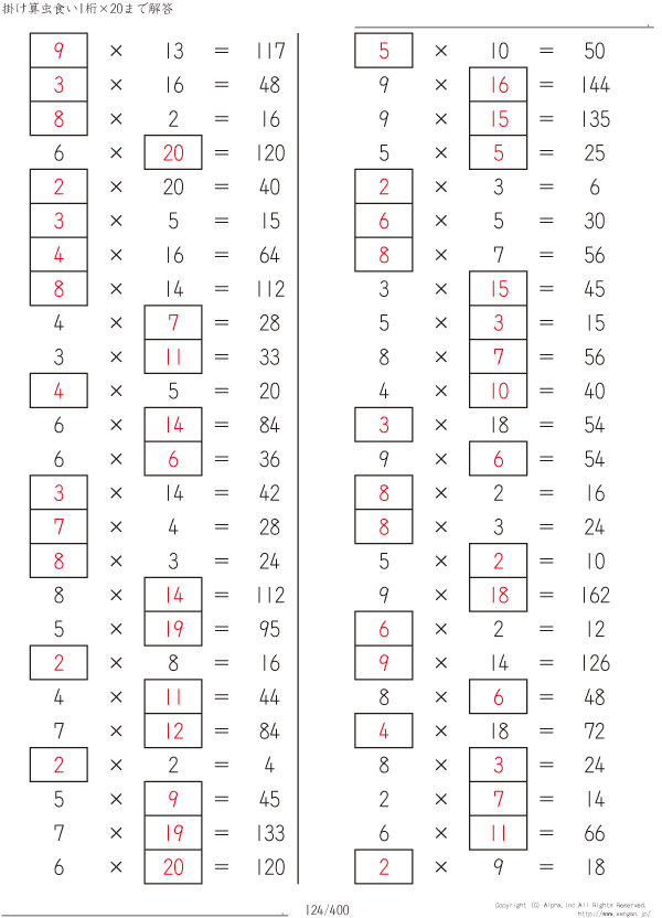 1桁かける20までの掛け算 [解答]124/400