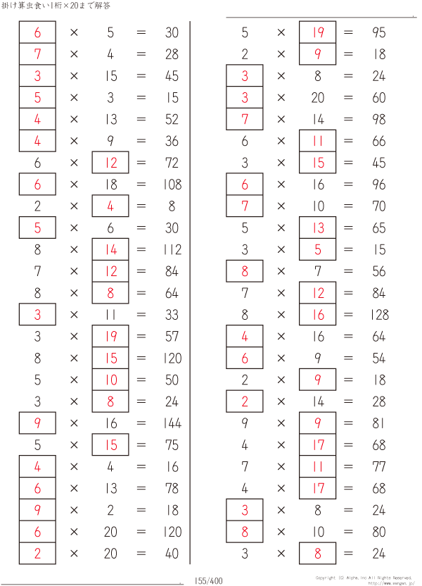 上記のボタンから「1桁かける20までの掛け算」の算数数学ドリル・計算ドリル(PDFプリント)がダウンロードできます。個人利用は無料です(家庭以外での配布は有料です)。