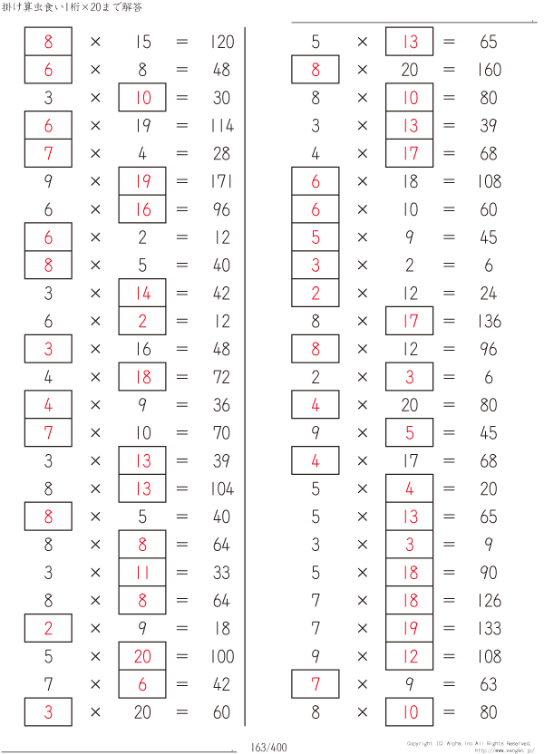 上記のボタンから「1桁かける20までの掛け算」の算数数学ドリル・計算ドリル(PDFプリント)がダウンロードできます。個人利用は無料です(家庭以外での配布は有料です)。