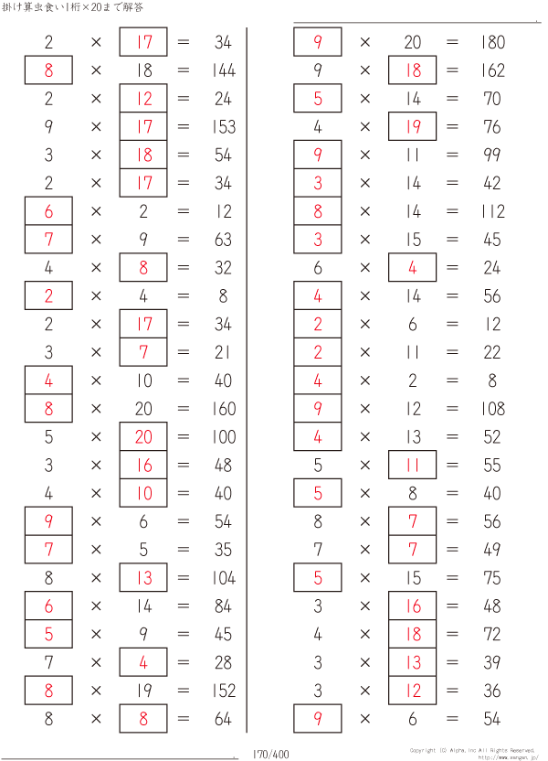 上記のボタンから「1桁かける20までの掛け算」の算数数学ドリル・計算ドリル(PDFプリント)がダウンロードできます。個人利用は無料です(家庭以外での配布は有料です)。