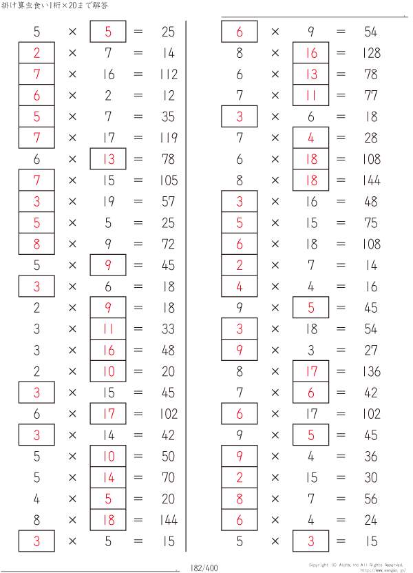 1桁かける20までの掛け算 [解答]182/400