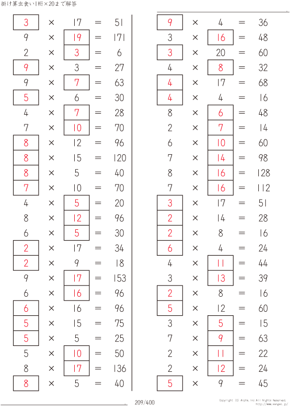 上記のボタンから「1桁かける20までの掛け算」の算数数学ドリル・計算ドリル(PDFプリント)がダウンロードできます。個人利用は無料です(家庭以外での配布は有料です)。