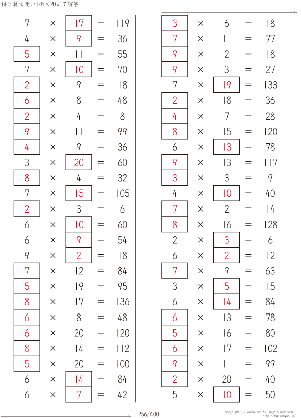 上記のボタンから「1桁かける20までの掛け算」の算数数学ドリル・計算ドリル(PDFプリント)がダウンロードできます。個人利用は無料です(家庭以外での配布は有料です)。