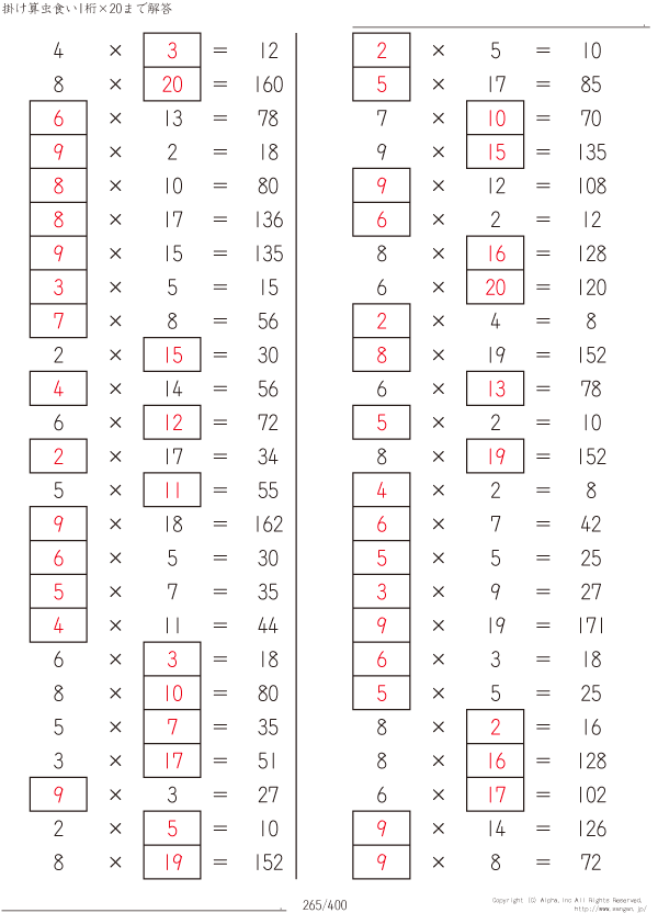 上記のボタンから「1桁かける20までの掛け算」の算数数学ドリル・計算ドリル(PDFプリント)がダウンロードできます。個人利用は無料です(家庭以外での配布は有料です)。