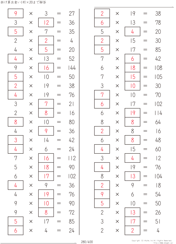 上記のボタンから「1桁かける20までの掛け算」の算数数学ドリル・計算ドリル(PDFプリント)がダウンロードできます。個人利用は無料です(家庭以外での配布は有料です)。
