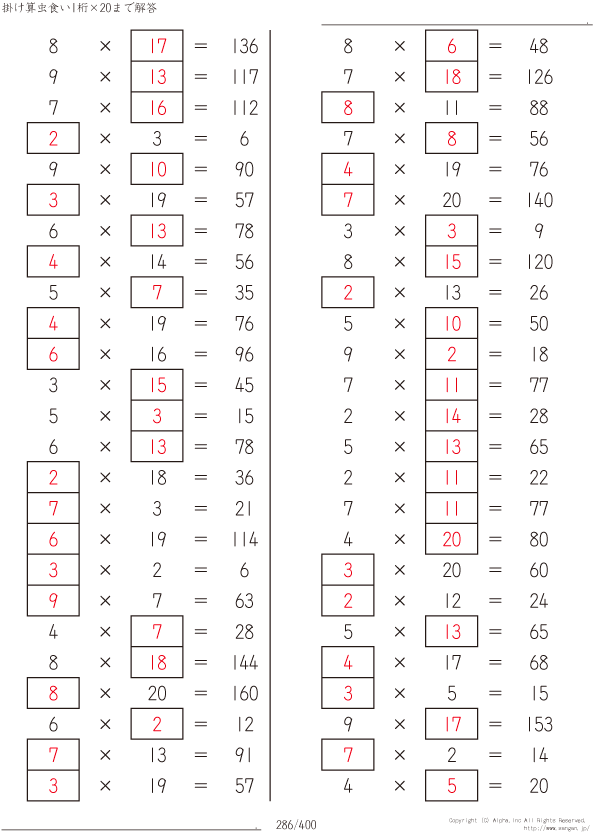 上記のボタンから「1桁かける20までの掛け算」の算数数学ドリル・計算ドリル(PDFプリント)がダウンロードできます。個人利用は無料です(家庭以外での配布は有料です)。