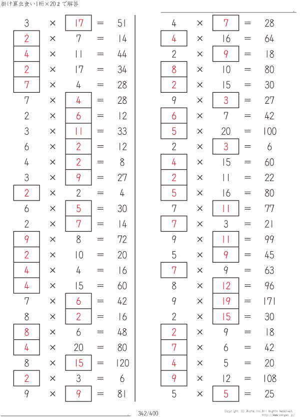 上記のボタンから「1桁かける20までの掛け算」の算数数学ドリル・計算ドリル(PDFプリント)がダウンロードできます。個人利用は無料です(家庭以外での配布は有料です)。