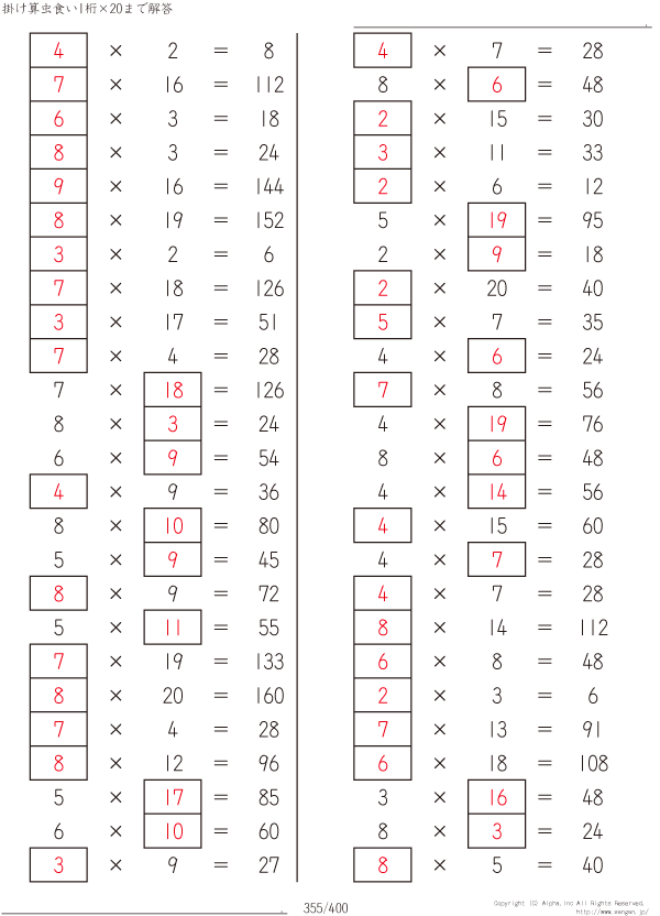 上記のボタンから「1桁かける20までの掛け算」の算数数学ドリル・計算ドリル(PDFプリント)がダウンロードできます。個人利用は無料です(家庭以外での配布は有料です)。