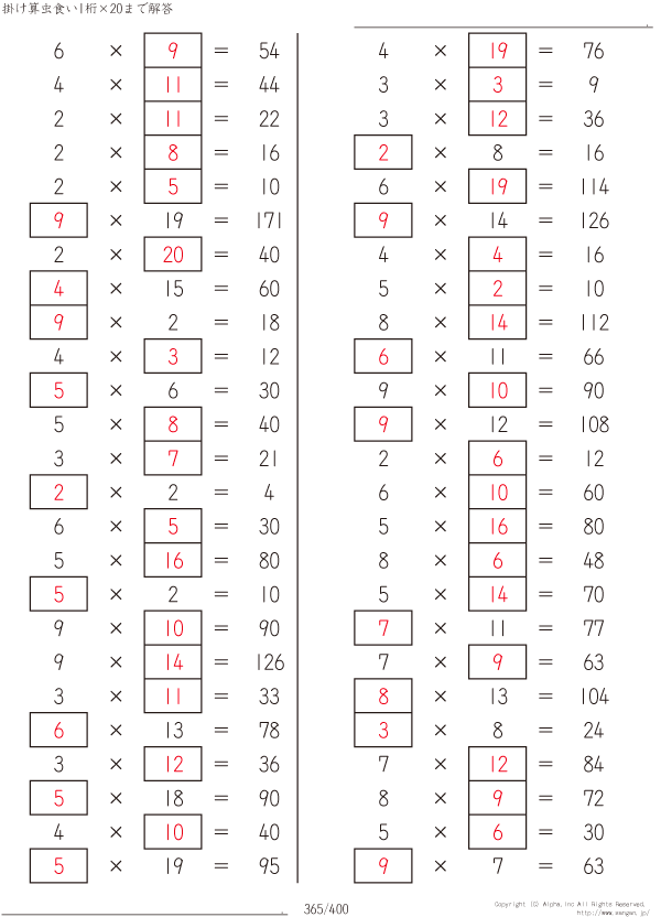 1桁かける20までの掛け算 [解答]365/400