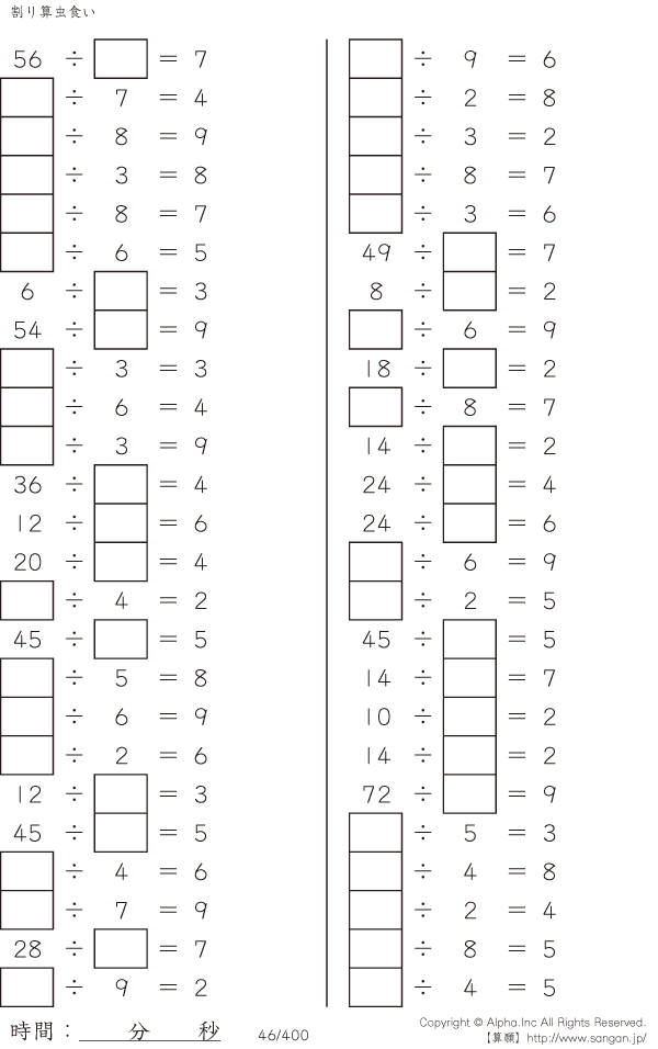 上記のボタンから「虫食い・割り算・あまりなし」の算数数学ドリル・計算ドリル(PDFプリント)がダウンロードできます。個人利用は無料です(家庭以外での配布は有料です)。
