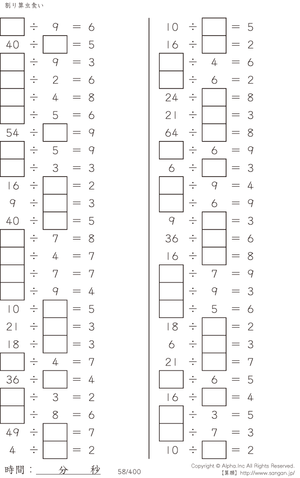 上記のボタンから「虫食い・割り算・あまりなし」の算数数学ドリル・計算ドリル(PDFプリント)がダウンロードできます。個人利用は無料です(家庭以外での配布は有料です)。