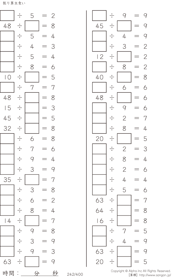 上記のボタンから「虫食い・割り算・あまりなし」の算数数学ドリル・計算ドリル(PDFプリント)がダウンロードできます。個人利用は無料です(家庭以外での配布は有料です)。