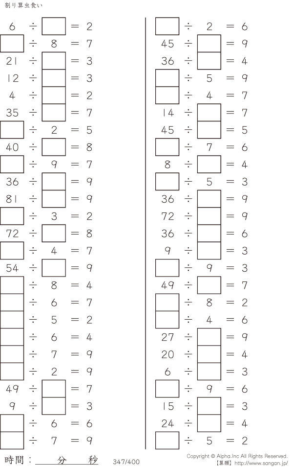 上記のボタンから「虫食い・割り算・あまりなし」の算数数学ドリル・計算ドリル(PDFプリント)がダウンロードできます。個人利用は無料です(家庭以外での配布は有料です)。