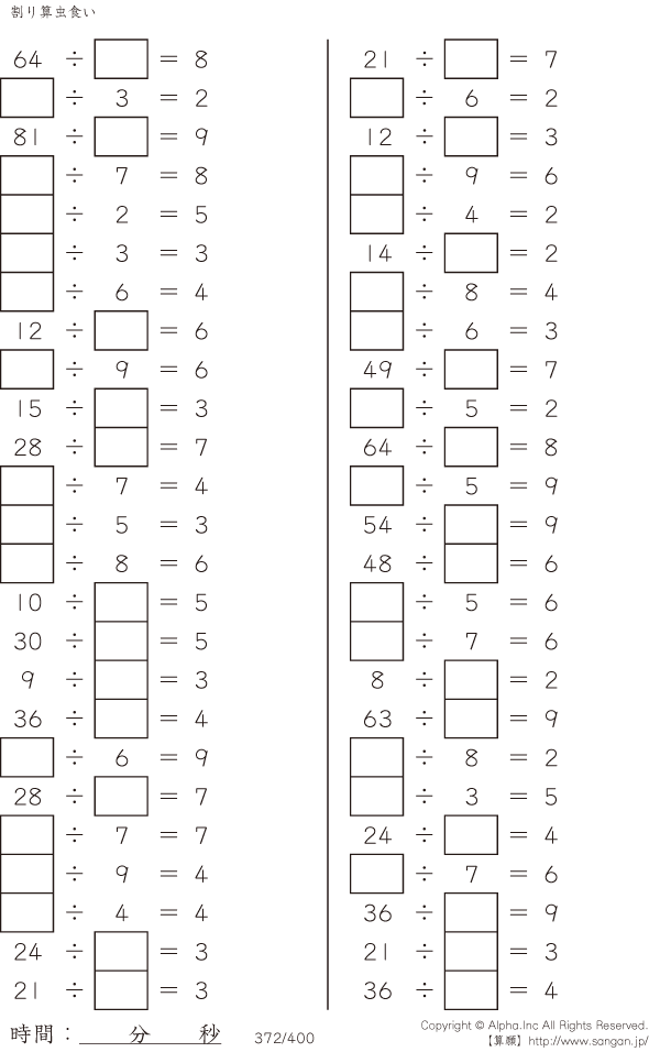 上記のボタンから「虫食い・割り算・あまりなし」の算数数学ドリル・計算ドリル(PDFプリント)がダウンロードできます。個人利用は無料です(家庭以外での配布は有料です)。