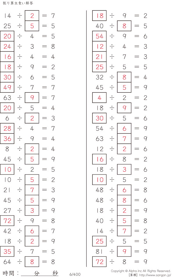 上記のボタンから「虫食い・割り算・あまりなし」の算数数学ドリル・計算ドリル(PDFプリント)がダウンロードできます。個人利用は無料です(家庭以外での配布は有料です)。