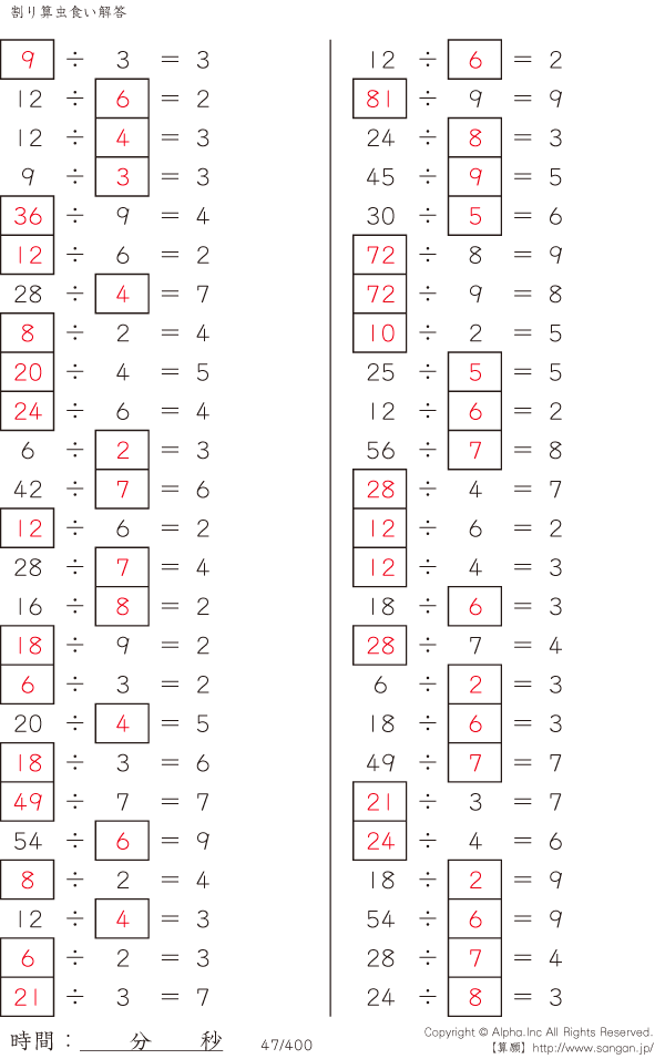上記のボタンから「虫食い・割り算・あまりなし」の算数数学ドリル・計算ドリル(PDFプリント)がダウンロードできます。個人利用は無料です(家庭以外での配布は有料です)。