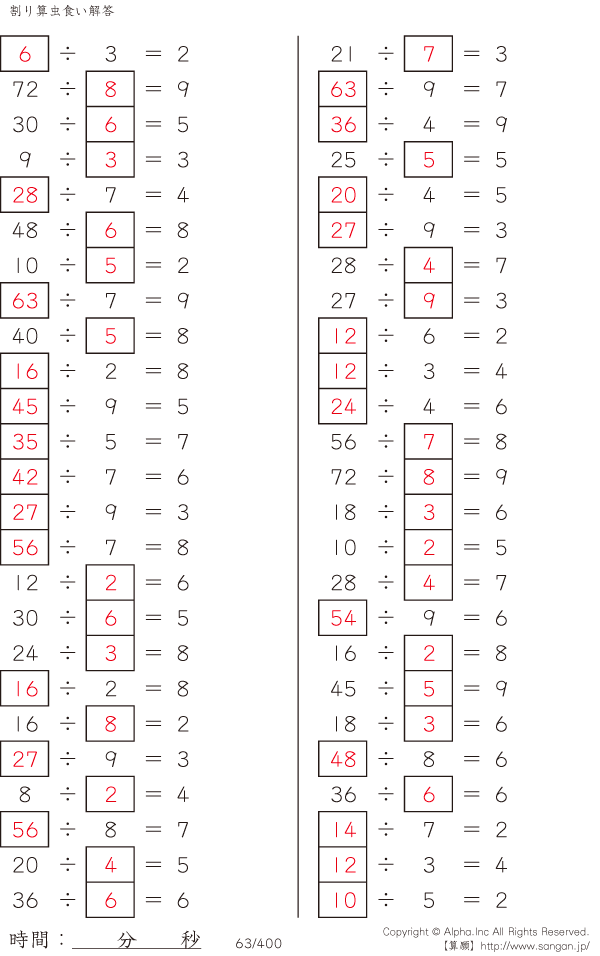 上記のボタンから「虫食い・割り算・あまりなし」の算数数学ドリル・計算ドリル(PDFプリント)がダウンロードできます。個人利用は無料です(家庭以外での配布は有料です)。
