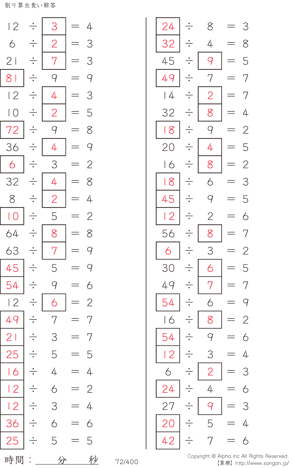 上記のボタンから「虫食い・割り算・あまりなし」の算数数学ドリル・計算ドリル(PDFプリント)がダウンロードできます。個人利用は無料です(家庭以外での配布は有料です)。