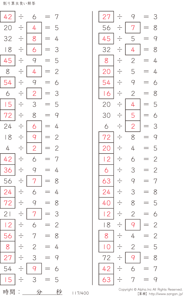 上記のボタンから「虫食い・割り算・あまりなし」の算数数学ドリル・計算ドリル(PDFプリント)がダウンロードできます。個人利用は無料です(家庭以外での配布は有料です)。