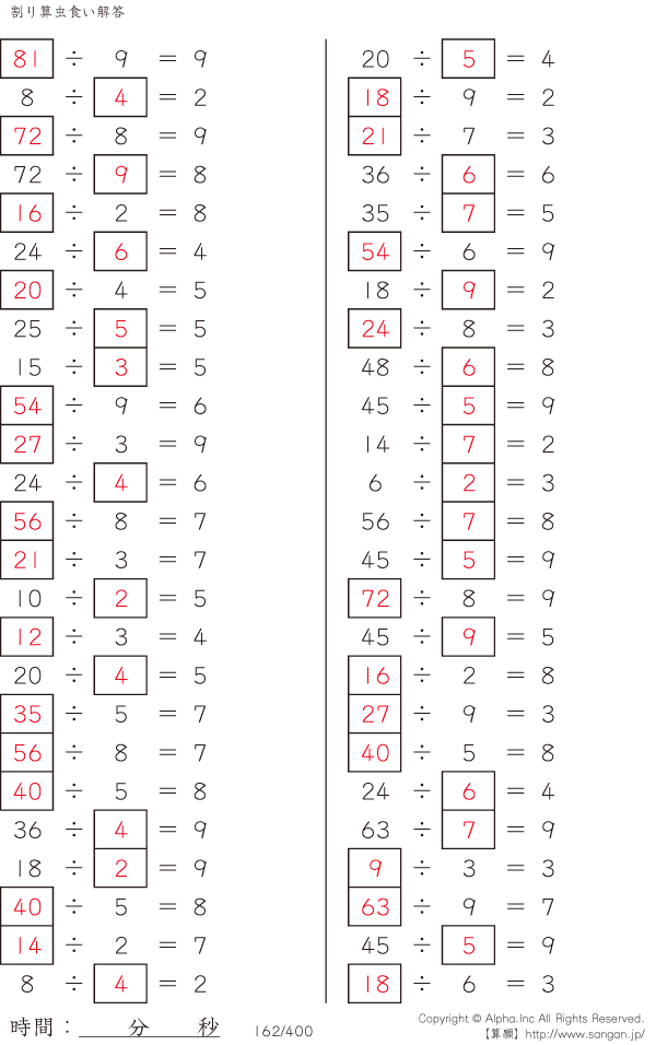 上記のボタンから「虫食い・割り算・あまりなし」の算数数学ドリル・計算ドリル(PDFプリント)がダウンロードできます。個人利用は無料です(家庭以外での配布は有料です)。