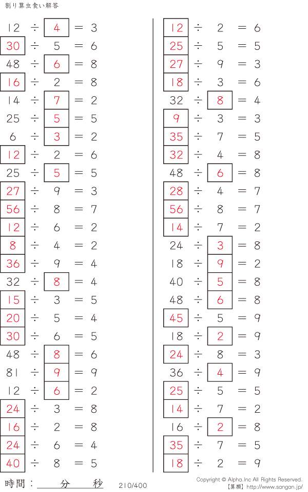 上記のボタンから「虫食い・割り算・あまりなし」の算数数学ドリル・計算ドリル(PDFプリント)がダウンロードできます。個人利用は無料です(家庭以外での配布は有料です)。