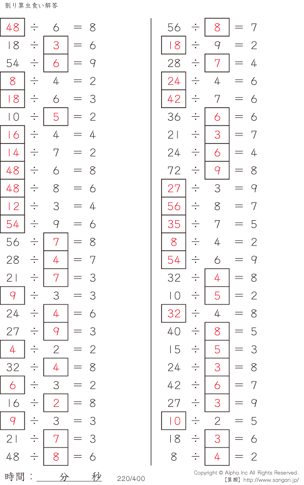 上記のボタンから「虫食い・割り算・あまりなし」の算数数学ドリル・計算ドリル(PDFプリント)がダウンロードできます。個人利用は無料です(家庭以外での配布は有料です)。