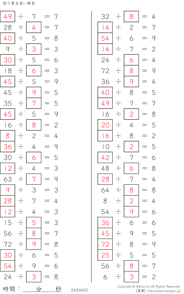 上記のボタンから「虫食い・割り算・あまりなし」の算数数学ドリル・計算ドリル(PDFプリント)がダウンロードできます。個人利用は無料です(家庭以外での配布は有料です)。