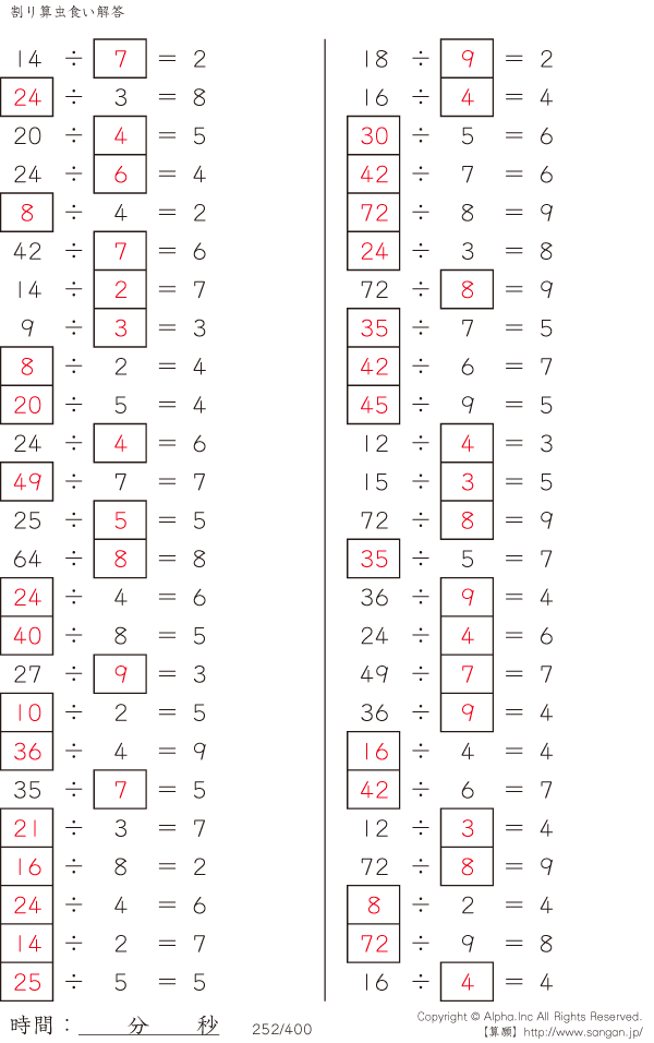 上記のボタンから「虫食い・割り算・あまりなし」の算数数学ドリル・計算ドリル(PDFプリント)がダウンロードできます。個人利用は無料です(家庭以外での配布は有料です)。