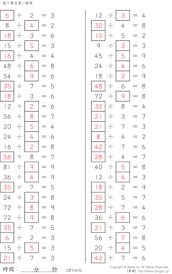 上記のボタンから「虫食い・割り算・あまりなし」の算数数学ドリル・計算ドリル(PDFプリント)がダウンロードできます。個人利用は無料です(家庭以外での配布は有料です)。