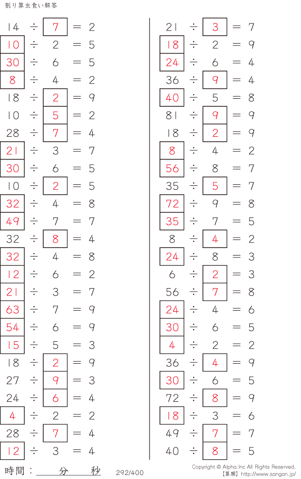 上記のボタンから「虫食い・割り算・あまりなし」の算数数学ドリル・計算ドリル(PDFプリント)がダウンロードできます。個人利用は無料です(家庭以外での配布は有料です)。