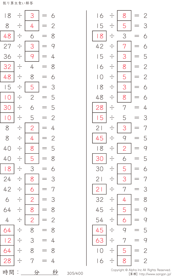 上記のボタンから「虫食い・割り算・あまりなし」の算数数学ドリル・計算ドリル(PDFプリント)がダウンロードできます。個人利用は無料です(家庭以外での配布は有料です)。
