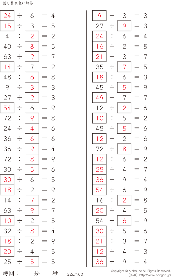 上記のボタンから「虫食い・割り算・あまりなし」の算数数学ドリル・計算ドリル(PDFプリント)がダウンロードできます。個人利用は無料です(家庭以外での配布は有料です)。