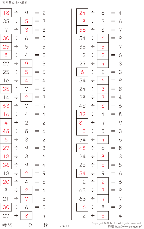 上記のボタンから「虫食い・割り算・あまりなし」の算数数学ドリル・計算ドリル(PDFプリント)がダウンロードできます。個人利用は無料です(家庭以外での配布は有料です)。