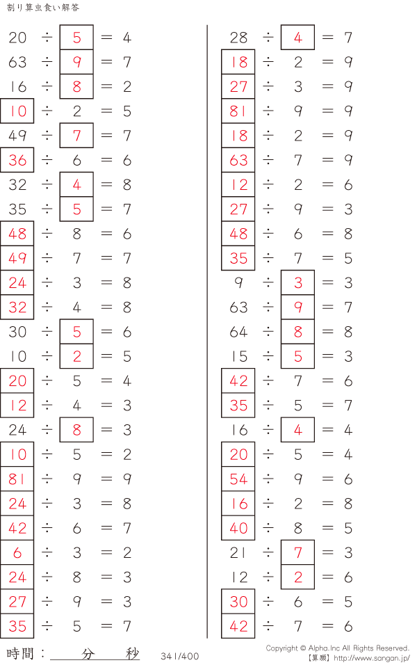 上記のボタンから「虫食い・割り算・あまりなし」の算数数学ドリル・計算ドリル(PDFプリント)がダウンロードできます。個人利用は無料です(家庭以外での配布は有料です)。