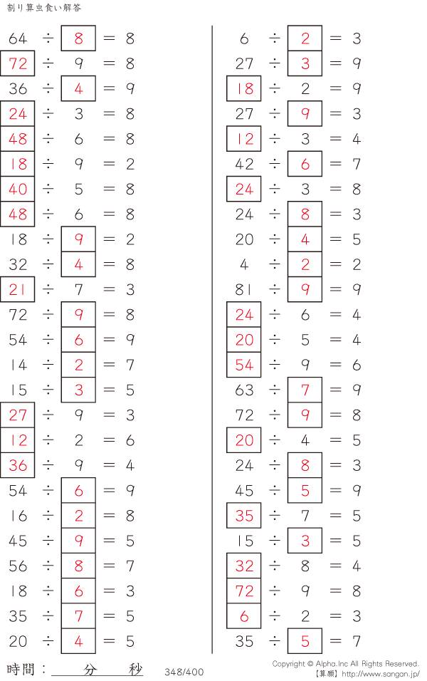 上記のボタンから「虫食い・割り算・あまりなし」の算数数学ドリル・計算ドリル(PDFプリント)がダウンロードできます。個人利用は無料です(家庭以外での配布は有料です)。
