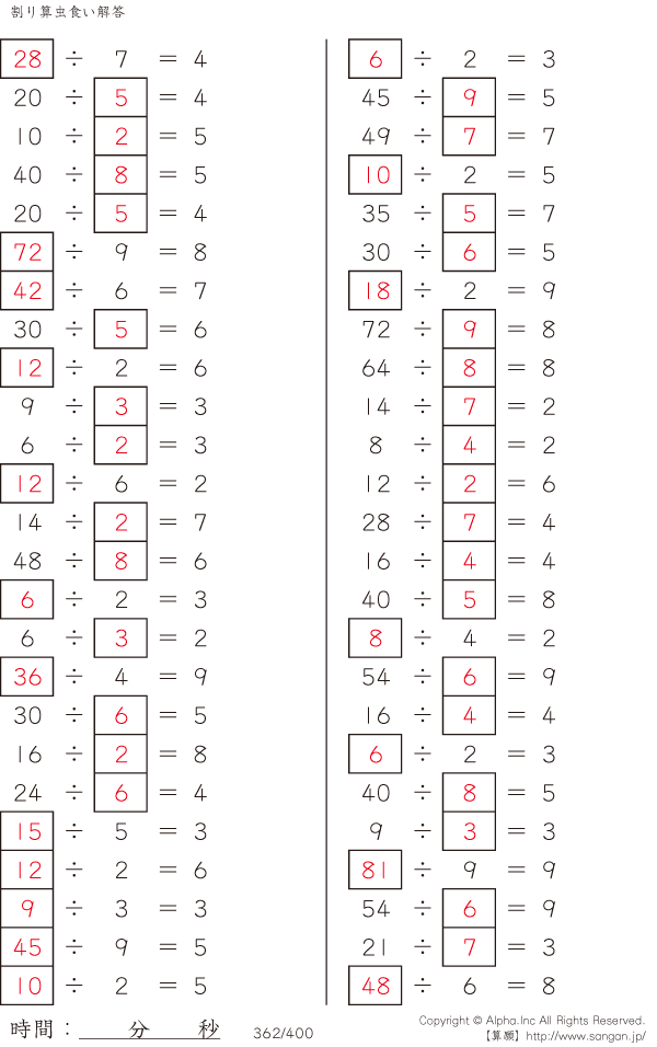 上記のボタンから「虫食い・割り算・あまりなし」の算数数学ドリル・計算ドリル(PDFプリント)がダウンロードできます。個人利用は無料です(家庭以外での配布は有料です)。