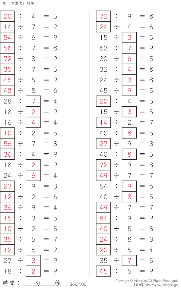 上記のボタンから「虫食い・割り算・あまりなし」の算数数学ドリル・計算ドリル(PDFプリント)がダウンロードできます。個人利用は無料です(家庭以外での配布は有料です)。