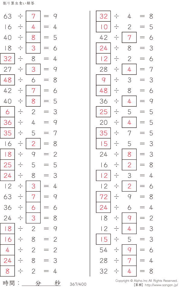 上記のボタンから「虫食い・割り算・あまりなし」の算数数学ドリル・計算ドリル(PDFプリント)がダウンロードできます。個人利用は無料です(家庭以外での配布は有料です)。
