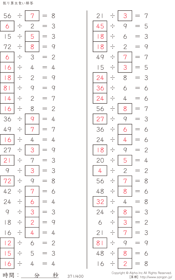 上記のボタンから「虫食い・割り算・あまりなし」の算数数学ドリル・計算ドリル(PDFプリント)がダウンロードできます。個人利用は無料です(家庭以外での配布は有料です)。