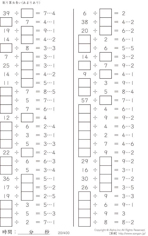 上記のボタンから「虫食い・割り算・あまりあり」の算数数学ドリル・計算ドリル(PDFプリント)がダウンロードできます。個人利用は無料です(家庭以外での配布は有料です)。