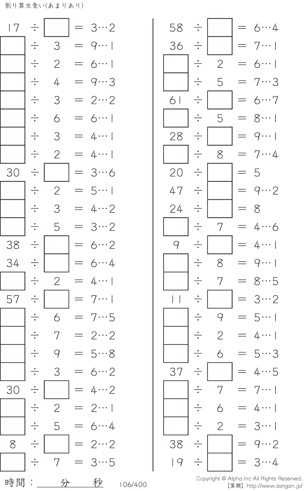 上記のボタンから「虫食い・割り算・あまりあり」の算数数学ドリル・計算ドリル(PDFプリント)がダウンロードできます。個人利用は無料です(家庭以外での配布は有料です)。