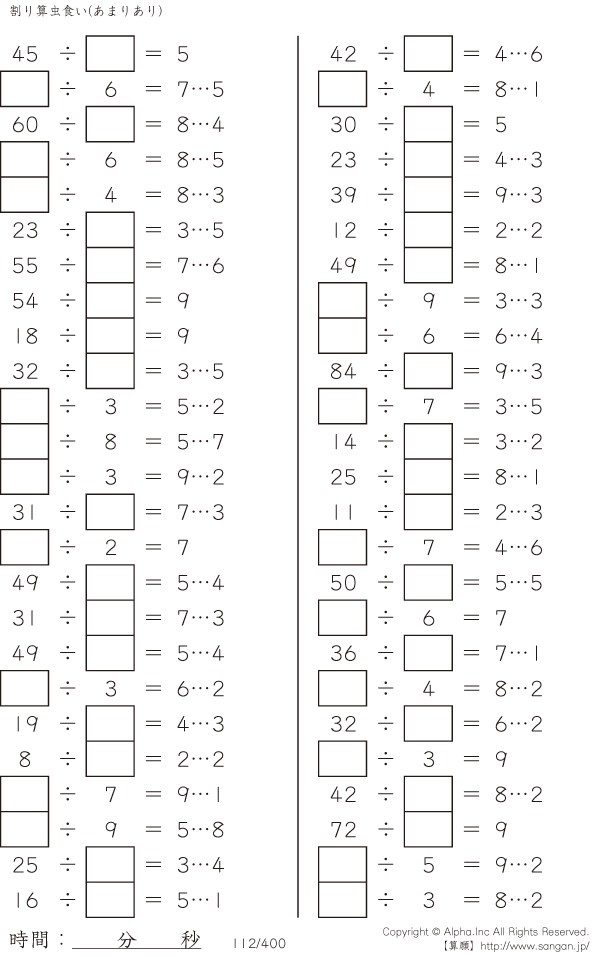 上記のボタンから「虫食い・割り算・あまりあり」の算数数学ドリル・計算ドリル(PDFプリント)がダウンロードできます。個人利用は無料です(家庭以外での配布は有料です)。