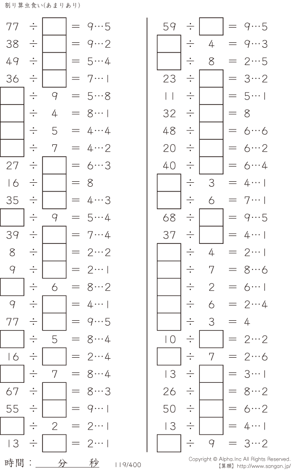 上記のボタンから「虫食い・割り算・あまりあり」の算数数学ドリル・計算ドリル(PDFプリント)がダウンロードできます。個人利用は無料です(家庭以外での配布は有料です)。